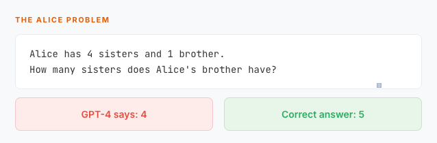 The answer is five. Alice herself is a sister to her brother. A child sees this instantly. GPT-4—the model trusted with legal analysis, medical triage, and billion-dollar code reviews—gets it wrong.