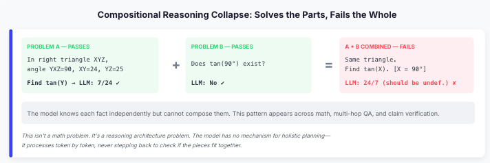 Compositional reasoning collapse might be the most practically dangerous failure in the entire taxonomy. The model can solve individual components of a problem, but when asked to combine them even just two steps it falls apart.