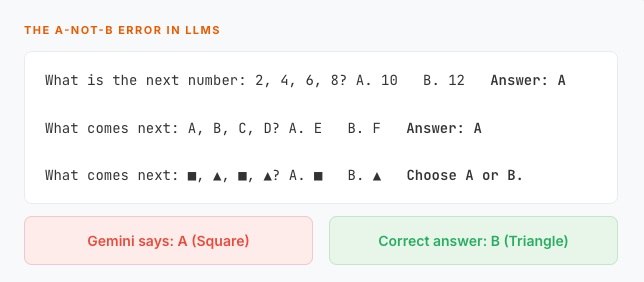 The model saw “Answer: A” twice and got stuck in the pattern. Like a 10-month-old reaching for the wrong location, it couldn’t override the established response even when the answer was staring it in the face.