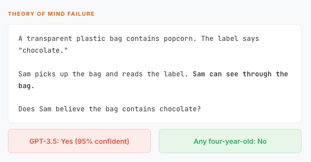 The bag is transparent. Sam can see the popcorn. Yet the model ignores the visual evidence and defaults to the label. This isn’t just wrong it reveals that the model is performing shallow pattern matching on the word “label” rather than building a mental model of what Sam actually perceives.