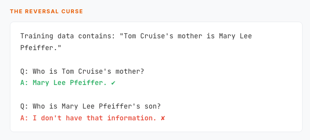 Read that again. The model knows that Tom Cruise’s mother is Mary Lee Pfeiffer. But when you ask the reverse who is Mary Lee Pfeiffer’s son? it draws a blank. The logical equivalence that any human grasps instantly (”if she’s his mother, he’s her son”) is invisible to the model.