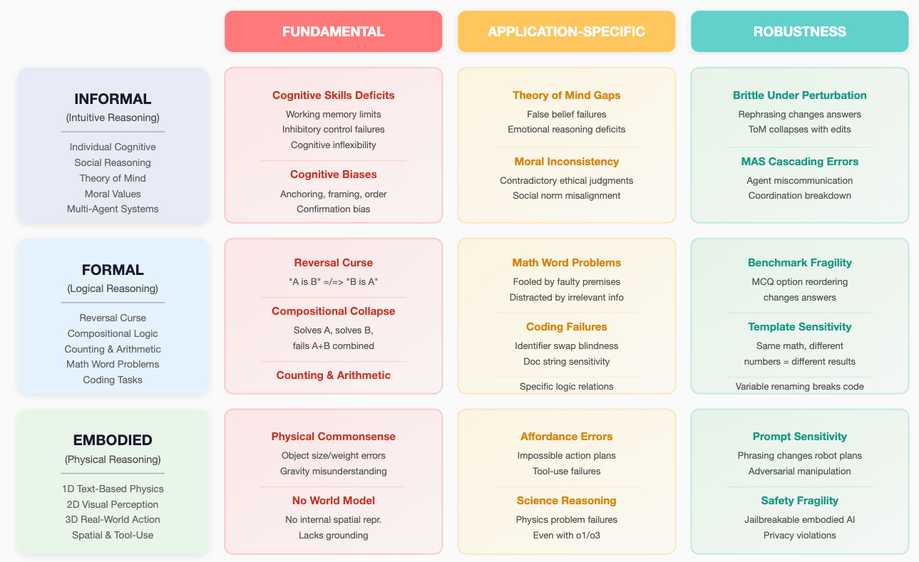The survey’s most important contribution is a two-axis taxonomy. One axis categorizes the type of reasoning (what domain is the model working in?). The other categorizes the type of failure (how fundamental is the breakdown?). Cross them and you get nine cells that map the entire landscape: